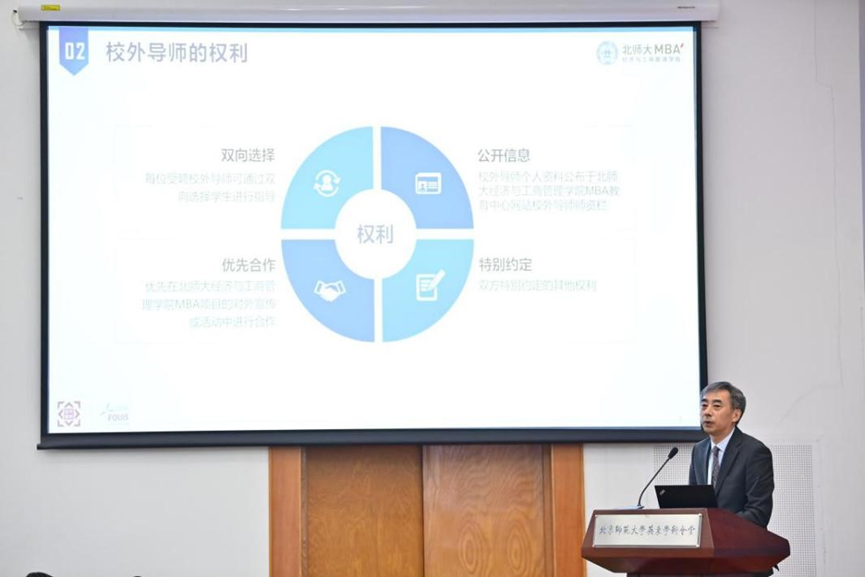 Sun Chuan, Director of MBA Education Center, introduced the responsibilities and duties of external MBA tutors of the School. The employment period of MBA external tutors is two years. The relationship between tutors and students is determined through two-way selection, and academic guidance is carried out in strict accordance with the Rules of Tutors. Tutors are required to abide by school rules and regulations and teachers' ethics. They should instruct each student for at least 10 hours a year and organize face-to-face activities at least once a year. In addition to performing their basic guidance duties, the university encourages tutors to participate in the construction of high-level industry-education integration platform, internship base construction, joint project management research and development, human resources cooperation, public welfare activities and other aspects. MBA of BNUBS would also provide exchange and sharing platform and reciprocity mechanism for tutors, and jointly develop enterprise classroom, so as to achieve a win-win situation for both schools and enterprises.
