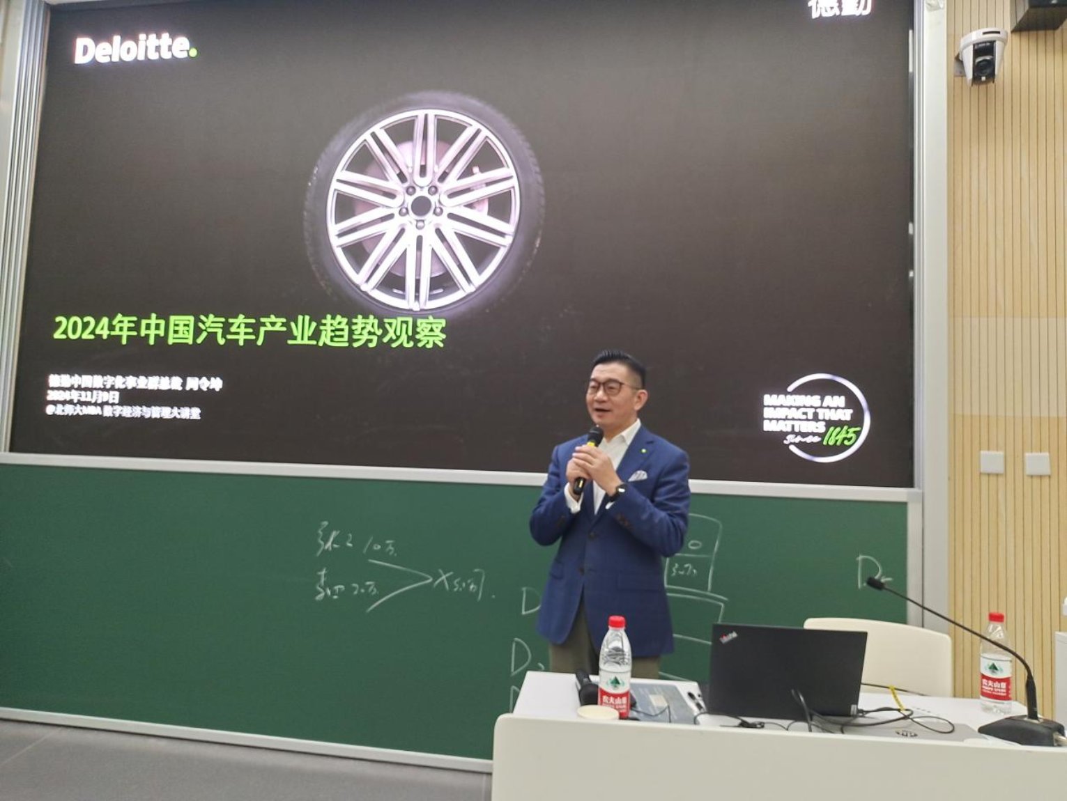 On the evening of November 9, 2024, the 37th lecture of the "Digital Economy and Management Lecture Hall" of BNUBS, titled Observation of the Development Trends of China's Automotive Industry, was held in the lecture hall of the Electronic Building. This lecture specially invited Zhou Lingkun, President of Deloitte China Digital Business Group, to give a lecture. Zhou Jianghua, Director of MBA Education Center, presided over the lecture, while Li Jing, Associate Director of MBA Education Center, and more than 150 undergraduate, master's, and doctoral students from the School attended to listen the lecture.
