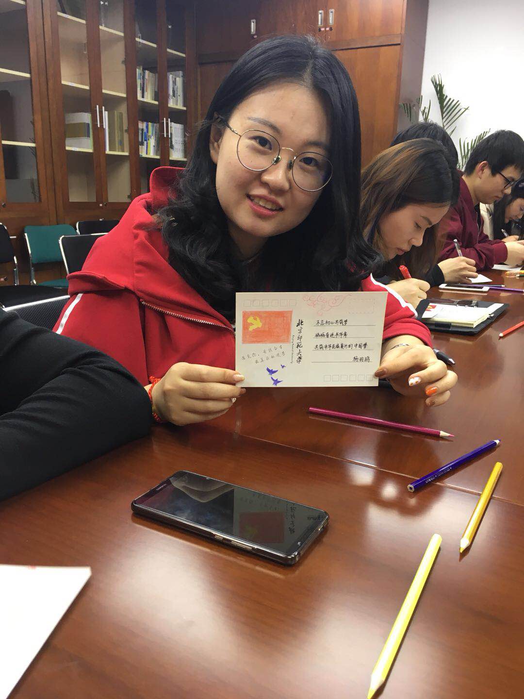 绘制活动正式开始后,给每个人发放明信片,运用彩色铅笔,用图画的形式抒发对祖国母亲的爱意。各个党员通过自己的理解并结合自己擅长的画法,采用各种形式来描绘,或高大建筑或花草致跃然纸上,既体现了祖国辽大深厚的历史文化底蕴,也体现了对祖国的深切祝福:用心作画并献礼于祖国母亲,不仅为庆生增彩,也成为历史文化的一部分。而明信片的背面,是师大经典建筑取景,也寓意师大历经风雨后沉淀下来的深厚底蕴,承载着师大人人的薪火相传,不忘初心,砥砺前行的拼搏精神。以此激发学生爱国热情,引导学生牢记时代使命,以不变初心永铸中华魂,迎风踏浪追逐中国梦。