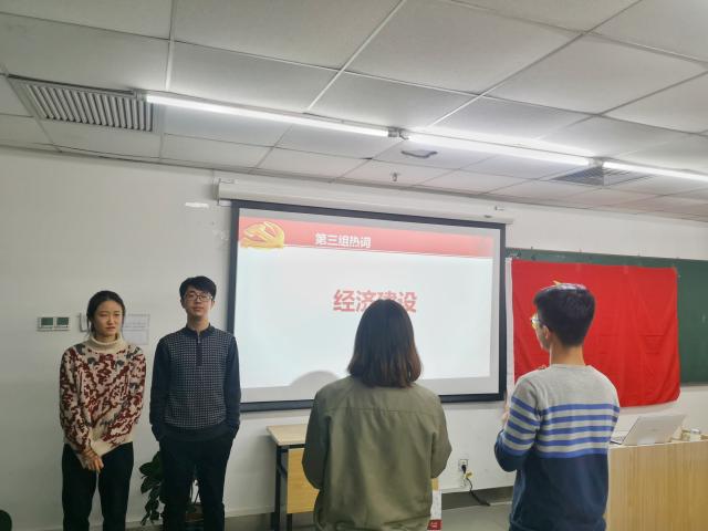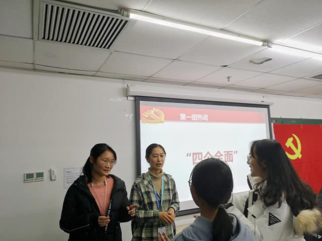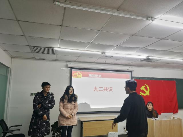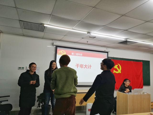 最后,支部组织了“你话我猜”的趣味学习活动。参加者被分为四组,针对时政热词、党史文化开始进行描述与猜词。大家积极参与,热情高涨,在欢声笑语中加深了对“四个全面”、“五位一体”、“习近平新时代中国特色社会主义思想”等词语的认识。最终,第三小组获得了第一名,支部书记为获奖同学颁发了奖品,并鼓励大家坚持理论学习和实践活动相结合,努力成为“政治上的明白人”。