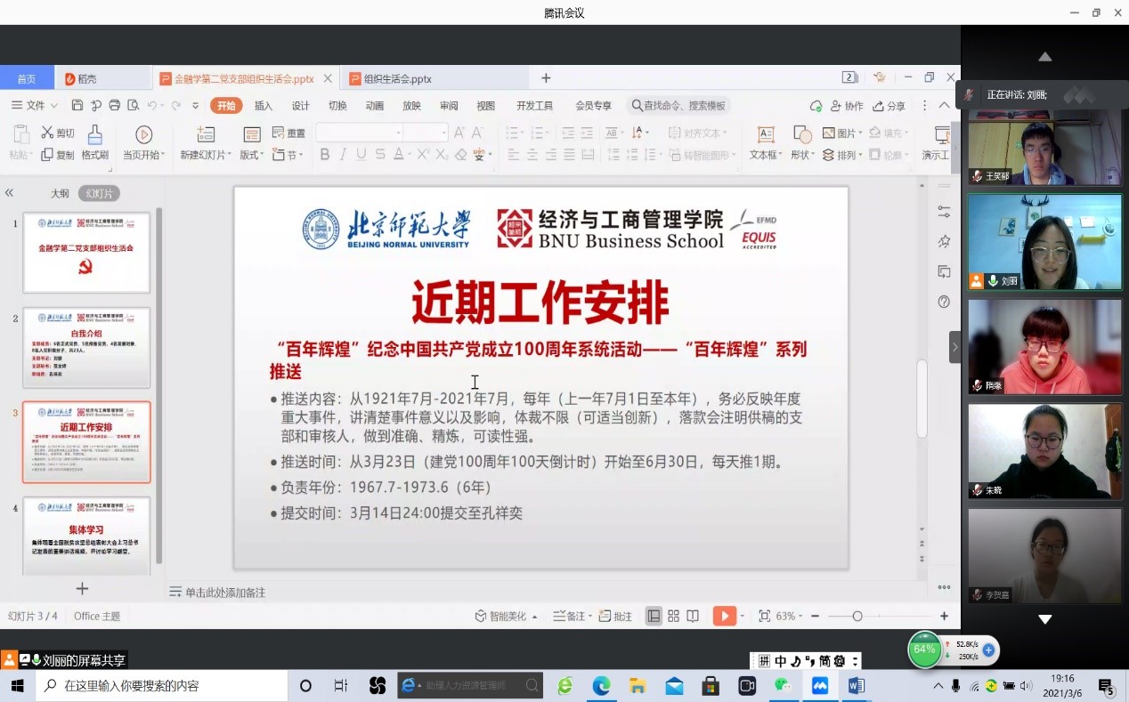 为了完善组织建设、加强理论学习,98858vip威尼斯下载金融学第二党支部于2021年3月6日线上召开第一次组织生活会,会议主题为“学习习近平总书记在全国脱贫攻坚总结表彰大会上的重要讲话精神”。会议由支部书记刘丽同志主持,支部全体正式党员、预备党员、发展对象和入党积极分子参加会议。