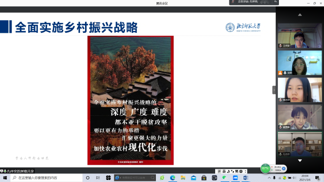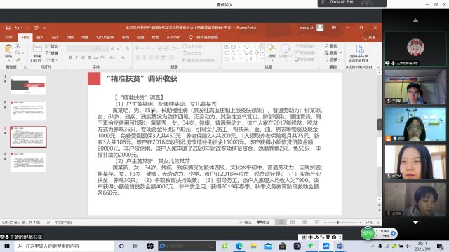 孔祥奕同学将脱贫攻坚与全面实施乡村振兴战略相结合,以自己家乡曹县淘宝村的“汉服”产业为例,讲述了脱贫过程中遇到的困难及克服困难的办法,同时他号召大家将自身的专业背景运用于乡村振兴之中,用自己的知识和能力为乡村的发展贡献一份力量。王紫同学分享了自己参加“精准扶贫”调研的收获,她以自己的家乡四川为背景,对石溪镇的一些贫困户进行了调研,深刻感受到扶贫应与扶智相结合,并提出了自己关于精准扶贫措施的一些思考,比如激发贫困群众脱贫内在动力、借助“互联网+文化”加大教育投入力度、加快贫困地区教育发展、适当培育科技扶贫龙头企业等。李艺华同学谈到脱贫摘帽不是终点而是新生活奋斗的起点,身为新时代青年的我们,应当发扬脱贫攻坚精神,积极参与支教下乡等活动,宣传家乡脱贫成果,将祖国的发展落实到自身的责任担当。