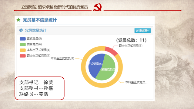 首先,支部书记徐荧同志介绍了党支部成员的组成情况,介绍了最近有关“百年辉煌”系列推送的支部工作安排,并鼓励大家积极参与,展示支部风采。