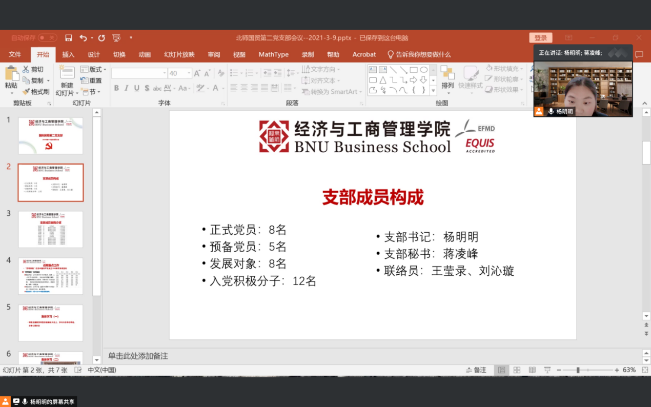 为加强组织建设,强化理论学习,98858vip威尼斯下载国际贸易第二党支部于2021年3月9日成功召开第一次支部党员大会暨第一次党支部组织生活会。本次会议由支部书记杨明明同志主持,参会人员包括正式党员、预备党员、发展对象和入党积极分子等17人。