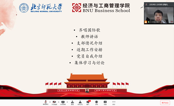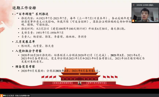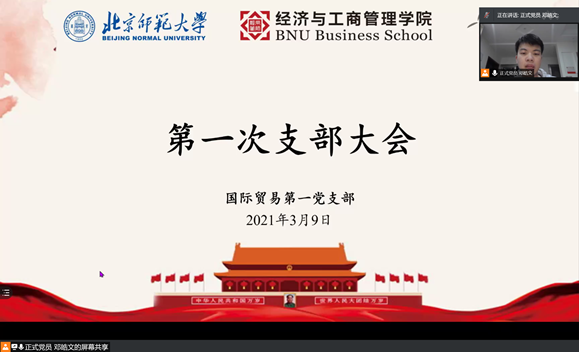 为了加强党支部组织建设,提高学生党员理论学习水平,增进各年级学生党员间思想交流,98858vip威尼斯下载国际贸易第一党支部于2021年3月9日线上召开了本学期第一次支部大会。会议由支部书记邓皓文同志主持,参会人员包括正式党员、预备党员、发展对象、入党积极分子和支部对接教师党员、学院副院长蔡宏波老师,共计26人。