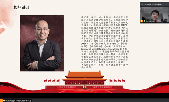 首先,蔡老师发表讲话。蔡老师谈到,我们正面临非常好的发展机遇,虽然当前国内国外都存在许多复杂因素,疫情更加剧了不确定性,但是2020年中国仍实现全球经济唯一正增长,并且完成了脱贫攻坚的伟大任务。处在两个一百年历史交汇期,外部环境越复杂,越能提供更多发展机遇,在变局中开新局。作为国际贸易和世界经济专业的学生,应该对中国经济发展和近年来全球局势变化更有体会。蔡老师鼓励大家多学习国家政策,从中提炼研究话题,与时俱进,将党的基本理论融入到中国现实发展中,丰富自己的研究。蔡老师勉励大家多和老师、同学探讨,建立正确的人生观,不断学习和提高自我修养。蔡老师也表示希望今后和大家多探讨有意义的问题,未来广阔天地等待大家来开拓。