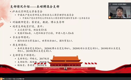接着,支部书记邓皓文同志向大家介绍了国际贸易第一党支部的基本情况和成员组成,并介绍了近期工作安排。支部现有7名正式党员,5名预备党员,6名发展对象、13名入党积极分子。