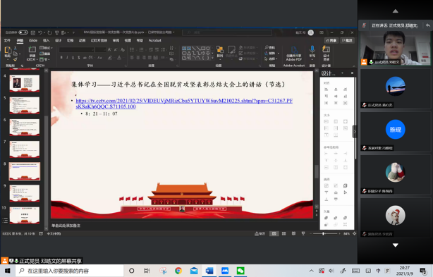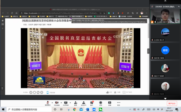 然后,全体成员线上一同观看了全国脱贫攻坚总结表彰大会视频节选。党的十八大以来,以习近平总书记为核心的党中央团结带领全党全国各族人民,把脱贫攻坚摆在治国理政的突出位置,充分发挥党的领导和我国社会主义制度的优势,采取了许多具有原创性、独特性的重大举措,组织实施了人类历史上力度最强、规模最大的脱贫攻坚战。在2021年全国脱贫攻坚总结表彰大会上,习近平总书记庄严宣告,经过全党全国各族人民共同努力,在迎来中国共产党成立一百周年的重要时刻,我国脱贫攻坚战取得了全面胜利!创造了又一个标明史册的人间奇迹!这是中国人民的伟大光荣,是中国共产党的伟大光荣,是中华民族的伟大光荣!