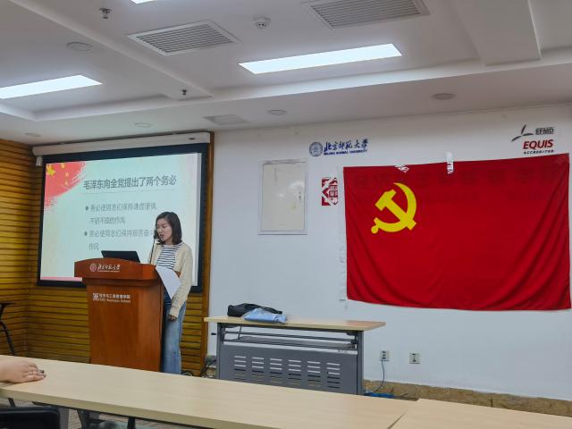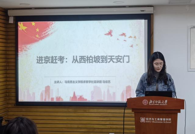 会计学第一党支部书记杨理钧首先简要介绍了马克思主义学院求索学社宣讲团及本次宣讲教育活动的主要流程。接着,宣讲员马佳艺同志以一段历史视频和精彩的讲解带我们回顾了“进京赶考”的国内外背景,从信念、精神、作风、能力等多方面深入分析了“进京赶考”的思想内涵,回答了谁是出卷人、谁是答卷人和谁是阅卷人的历史问题,并结合时政热点,指出了随着中国特色社会主义进入新时代,世界正在经历百年未有之大变局,中国共产党人的赶考永远在路上。最后,会计第一党支部书记杨理钧对本次活动进行总结,本次主题宣讲活动圆满结束。