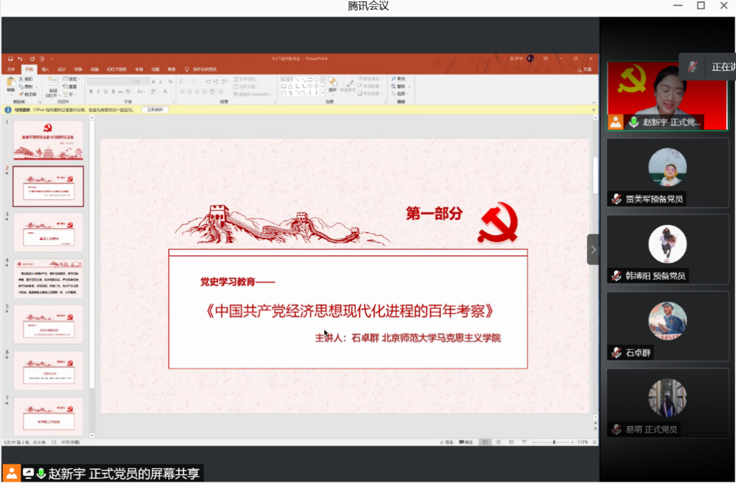 首先,支部邀请马克思主义学院硕士生石卓群同志讲授主题党课《中国共产党经济思想现代化进程的百年考察》。石卓群同志以重大思想决策的论争为主线,用极具代表性的事件作为例子,详细地介绍了中国共产党经济思想现代化的发展过程。此次党课,将经济学专业理论实践与支部党课学习紧密结合,既加深了同志们对党史的认识和理解,也增强了同志们的专业素养。