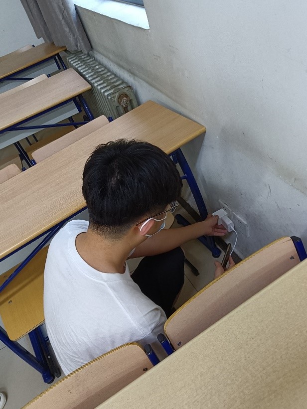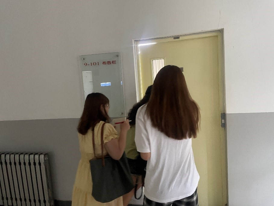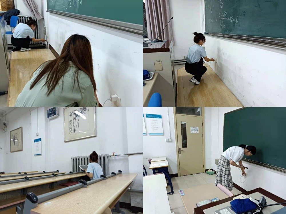 5月30日晚上6点,四位支书首先来到教九楼实地考察,在查看了几个屋子电源分布情况之后,几人讨论了关于电源位置和损坏程度如何可视化的问题,最终达成共识,决定采用平面图手绘点位做标记的方式直观展示电源情况。接着,一行人又前往教室较密集、类型也较多的教二楼,遇到了新的问题:教室的大小不一,如果仅仅是标明电源位置并不能充分展示该教室的电源密度。基于这种情况,四人又探讨出可行方案,即在平面图标明座位数,这样既能观察到电源情况,也能提前判断教室大小,给同学们提供更多便利。