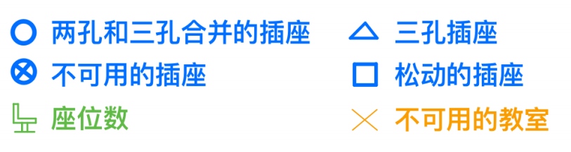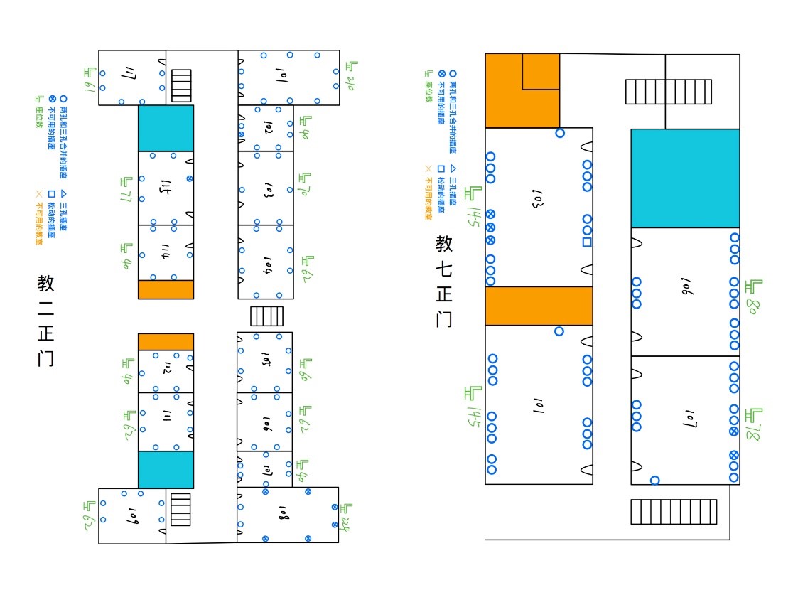 现场调研结束后,各支部的同志们将电源类型、可用与否、松动情况以及教室座位数量情况根据统一图例标记在平面图上,并将数据信息填写在共享文档中,最后由金融学第一党支部书记赵加良将各个教学楼的平面图以及Excel表加以汇总整理,最终得到一份教学楼电源分布手册,手册预览及统一图例如下图所示。