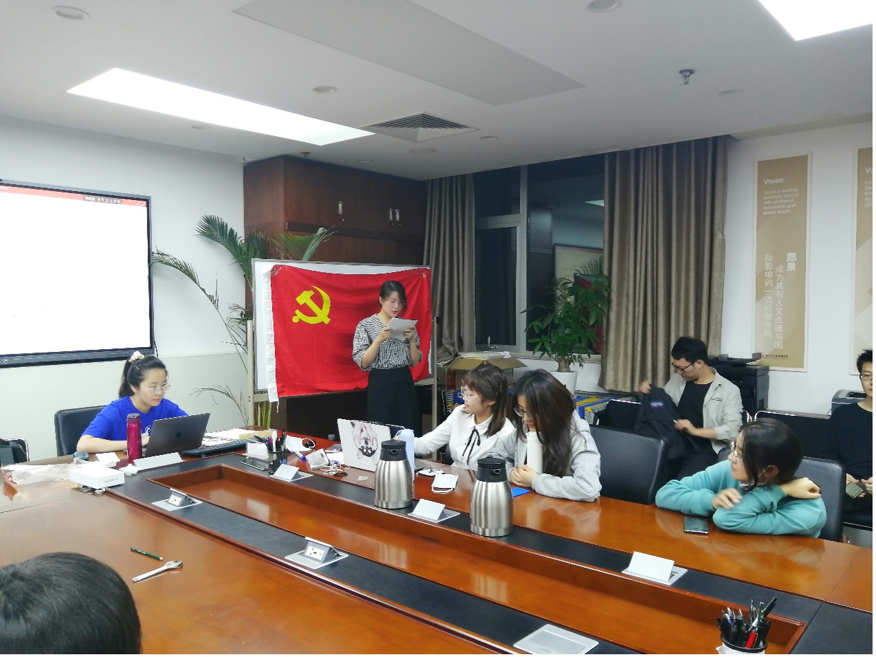 会议开始,全体党员起立,面向党旗齐唱《国际歌》。党支部书记刘松月介绍转正会议议程及本次会议党员的出席情况。