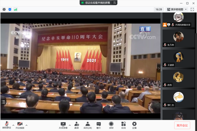 首先,全体成员共同观看了习近平总书记在纪念辛亥革命110周年大会上的讲话。110年前,以孙中山先生为代表的革命党人发动了辛亥革命,结束了统治中国几千年的君主专制制度,近代以来中国发生的深刻社会变革由此拉开了序幕。这是中国人民和中国先进分子为实现民族独立、人民解放进行的一次伟大而艰辛的探索。110年后的今天,我们深切缅怀孙中山先生等辛亥革命先驱的历史功勋,学习和弘扬110年前先进青年知识分子和革命青年为振兴中华而矢志不渝的崇高精神,激励和团结海内外青年为实现中华民族伟大复兴而共同奋斗。