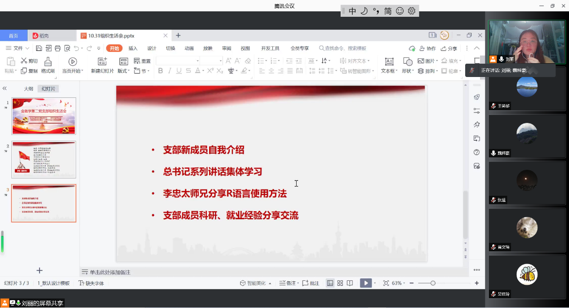 最后,博士生党员李忠太同志向同学们分享了学习R语言的心得,介绍到R语言相较于stata和python更易上手,并向大家推荐了《R语言数据科学》一书;硕士生入党积极分子郭凡溶同志分享了自己保研的心得,尽早进行有针对性的准备,及时获取信息。刘丽同志鼓励本科生同学和师兄师姐积极交流,逐渐明晰学业和职业规划。