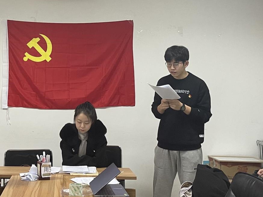 首先,马永骎同志在党旗下宣读《入党志愿书》,向党组织汇报个人对党的认识、入党动机、履历以及家庭和主要社会关系情况,表达了自己愿意为党的伟大事业奋斗终身的意愿。接着,入党介绍人介绍了发展对象的有关情况。参会人员听取了发展对象的政审报告和公示结果后,对发展对象的优缺点进行了充分讨论,并对其能否加入中国共产党表明意见。赵加良、宋肖肖、张天硕等同志对马永骎在考察期间的表现表示肯定,表扬了他做事负责任、办事效率高的优点,同时也指出做事略有急躁等问题,希望今后能够改正,更加踏实细心。随后,支部有表决权的正式党员进行无记名投票,张瑞婷同志进行计票,赵加良同志进行监票。支部书记宣读票决结果和支部大会决议,认为马永骎同志已基本具备共产党员的条件,同意接收其为预备党员。