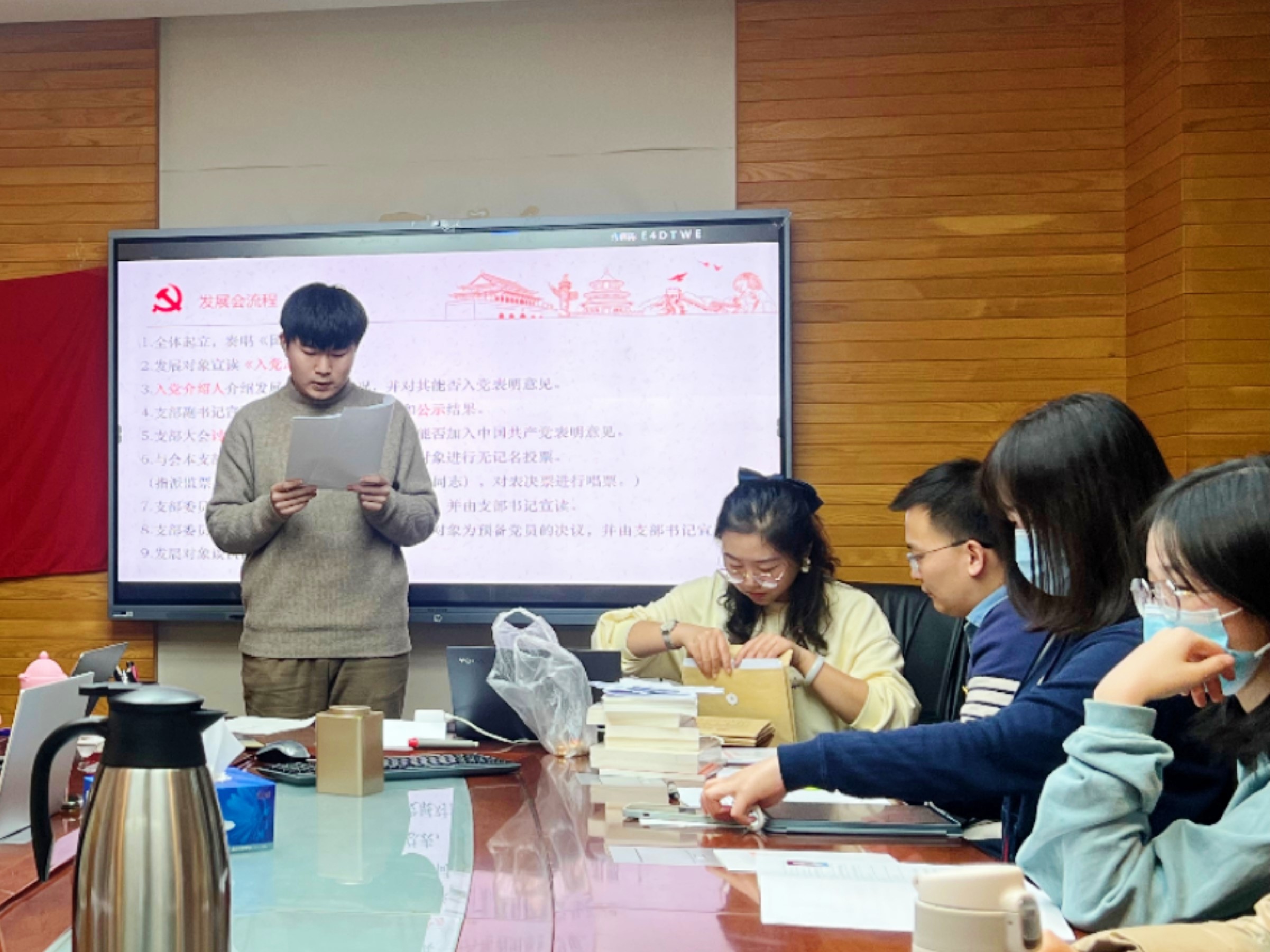 会议开始,党支部书记赵新宇介绍了发展会会议议程及本次会议党员的出席情况。全体党员起立,奏唱《国际歌》。