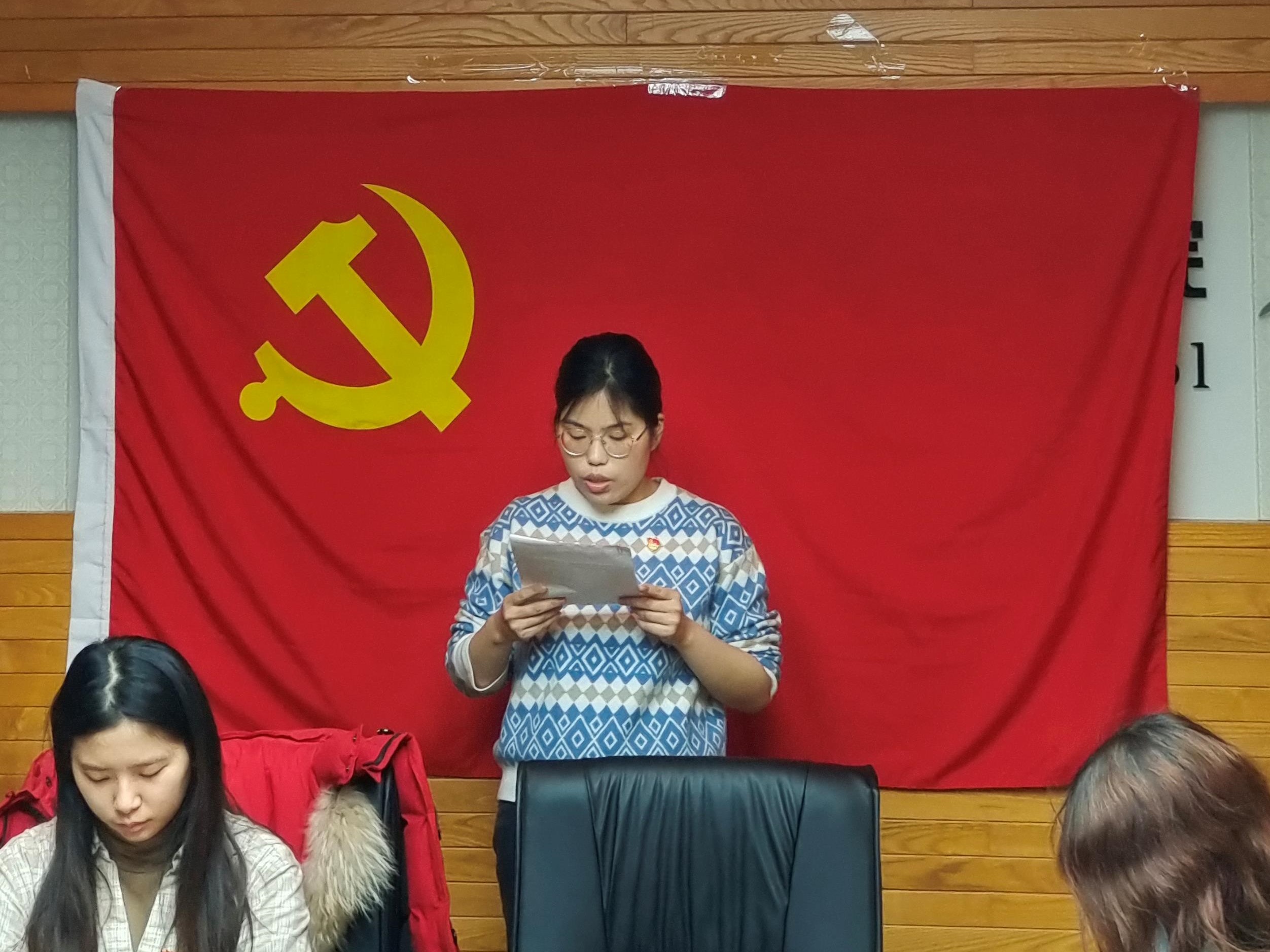 会议伊始,全体党员起立,面向党旗奏唱《国际歌》。党支部书记崔思璇介绍会议议程及本次会议党员的出席情况。