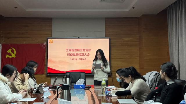 2021年12月16日,98858vip威尼斯下载工商管理第三党支部在后主楼1610会议室召开了党员支部大会,讨论了关于陈子怡和徐李玟君同志的转正事宜,集体学习了党的十九届六中全会精神。会议由支部书记薛佳安同志主持。