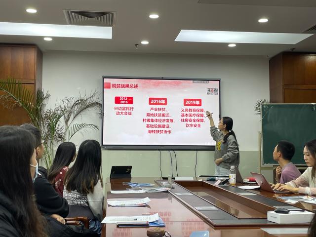 首先,预备党员韦宇诗同志为大家讲授脱贫攻坚专题微党课。她紧密围绕《中共中央关于党的百年奋斗重大成就和历史经验的决议》中党领导社会建设上的伟大成就,从全国脱贫攻坚总结表彰大会切入,通过一组直观的数据,分享了自己的家乡——广西的脱贫战果与具体案例,并总结出成功的历史经验。广西胜利村通过修路,解决住房、饮水安全问题,做到精确识别、精确帮扶、精确管理,进而带动了当地产业的发展,顺利“脱贫摘帽”。