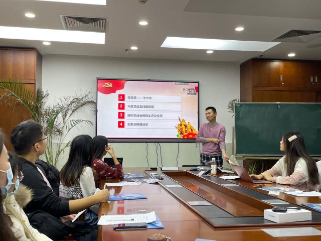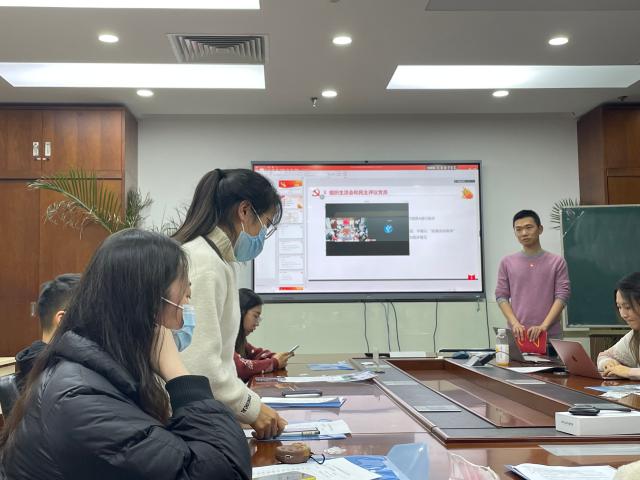 接着,支部书记郭睿同志代表支委会汇报总结了2021年度支部在组织生活和党员发展等方面的工作。他感谢每一位党员的辛勤付出,在大家的共同努力下,支部在七一表彰中被评为“98858vip威尼斯下载先进学生党支部”,但同时指出支部与标杆党支部及其他优秀党支部间仍存在差距。他激励党员同志要用更高的标准严格要求自己,做到“多学一学、多动一动、多聊一聊、多带一带”,共同向更高的奋斗目标迈进。会上,支部党员开展谈心谈话,纷纷发表意见,共同查摆问题,为支部发展献言献策。组织委员胡镶同志认为有必要在集体理论学习后增设讨论环节,提高学习实效;青年委员王芯蕊同志表示,在当前疫情防控形势下,支部可以适当举办一些线上活动,增进交流;正式党员韩伊伽同志建议支部应多开展学术活动,促进支部成员之间更多的交流;正式党员冯智莹同志号召全体党员在加强理论学习的同时,也要勤于思考,将马克思主义生活化、具体化、实践化。