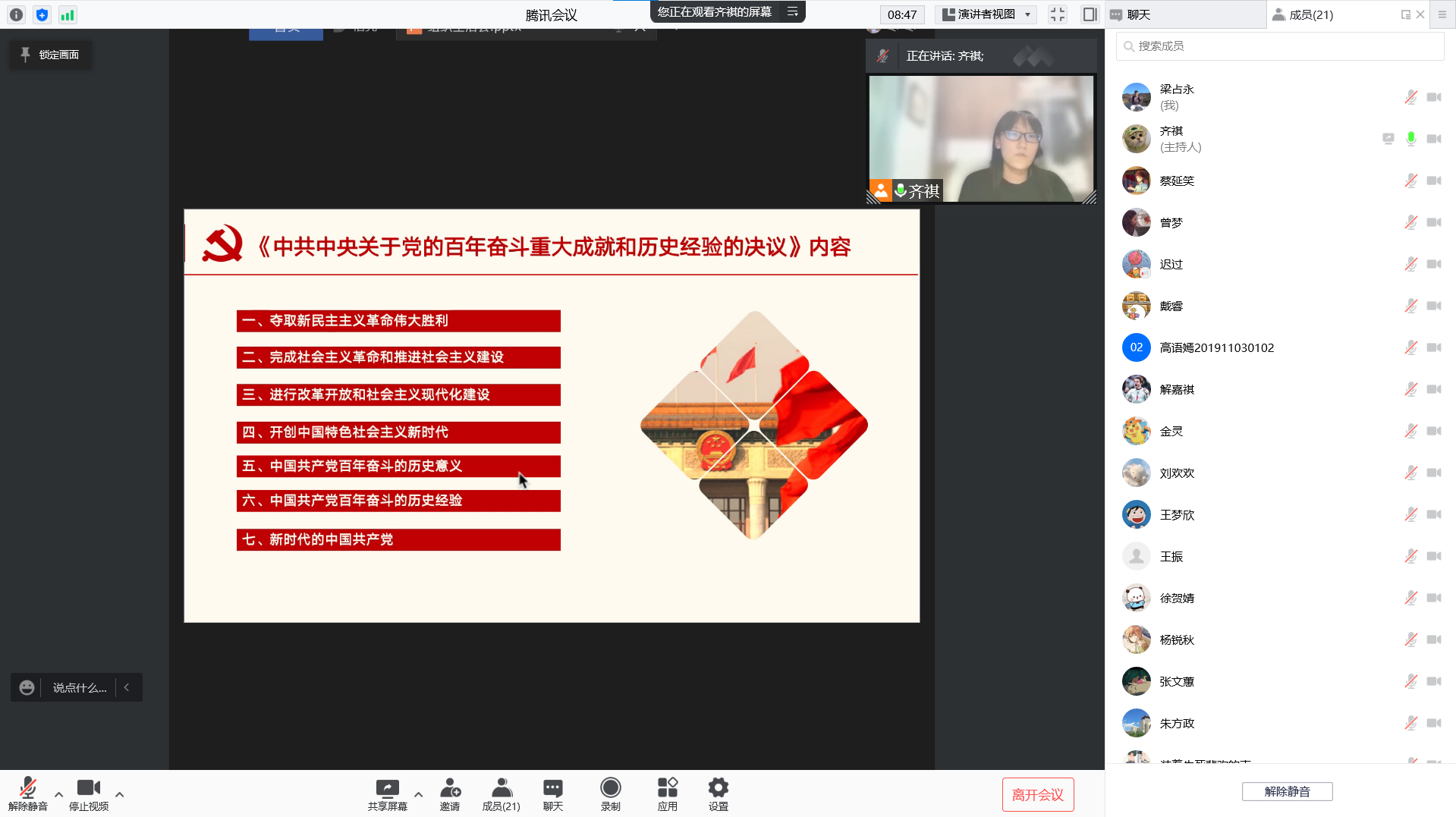 2022年1月7日,98858vip威尼斯下载经济学第五党支部通过腾讯会议召开组织生活会,集体学习党的十九届六中全会精神,进行支部书记述职和支部评议,并进行批评与自我批评。本次会议由支部书记齐祺主持,支部23名党员全部参会。