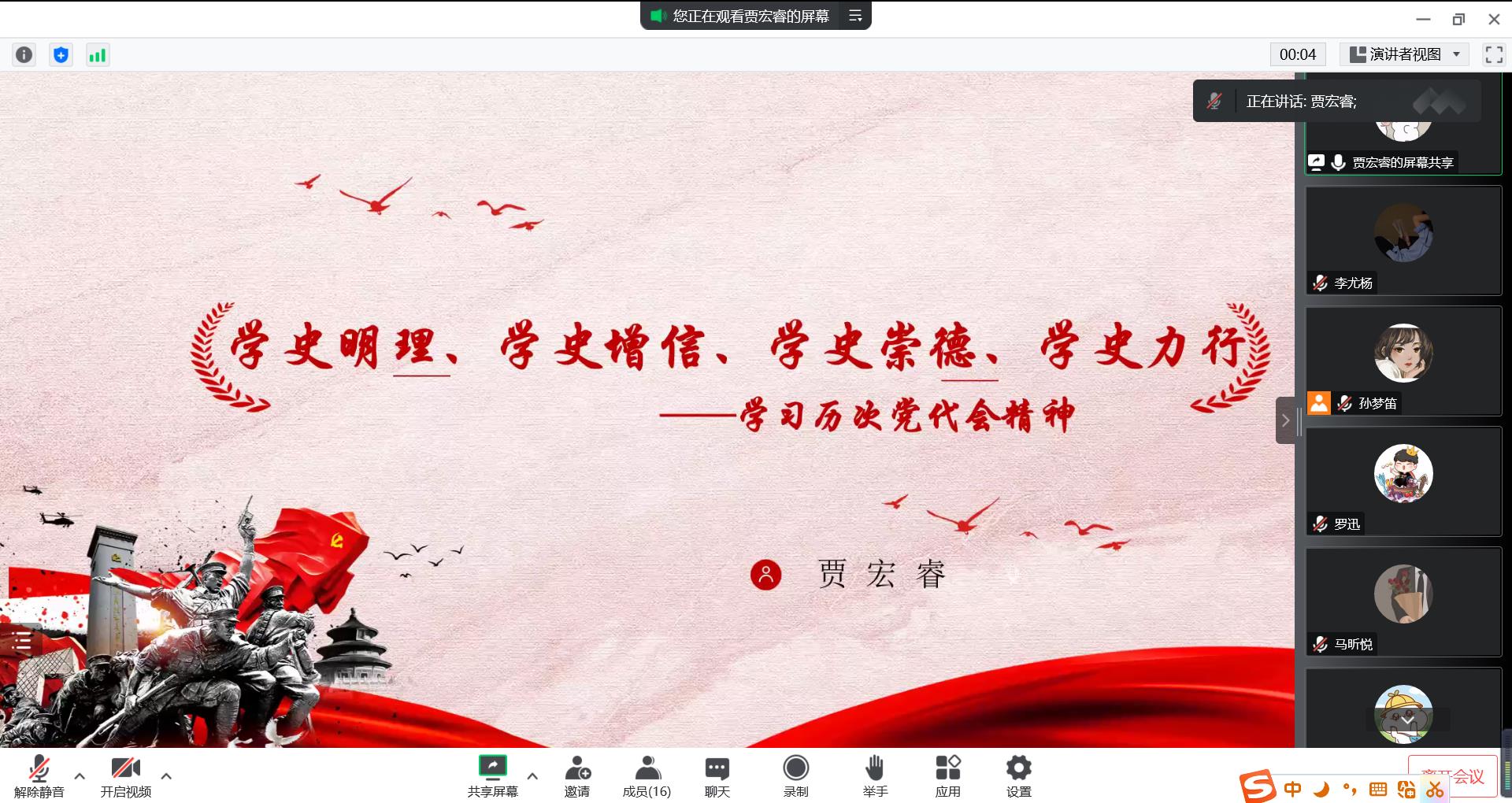 首先,贾宏睿以“学史明理、学史增信、学史崇德、学史力行”为主题,带领支部成员回顾历届党代会。从中共一大到十九大,一次次党代会的召开,不仅意味着党的壮大成熟,也蕴含着丰富的经验宝藏。她梳理了从中共一大到中共十九大历届党代会的核心内容,分享了中国共产党在历次代表大会精神指引下构筑起的具有丰富内涵的中国共产党精神谱系。