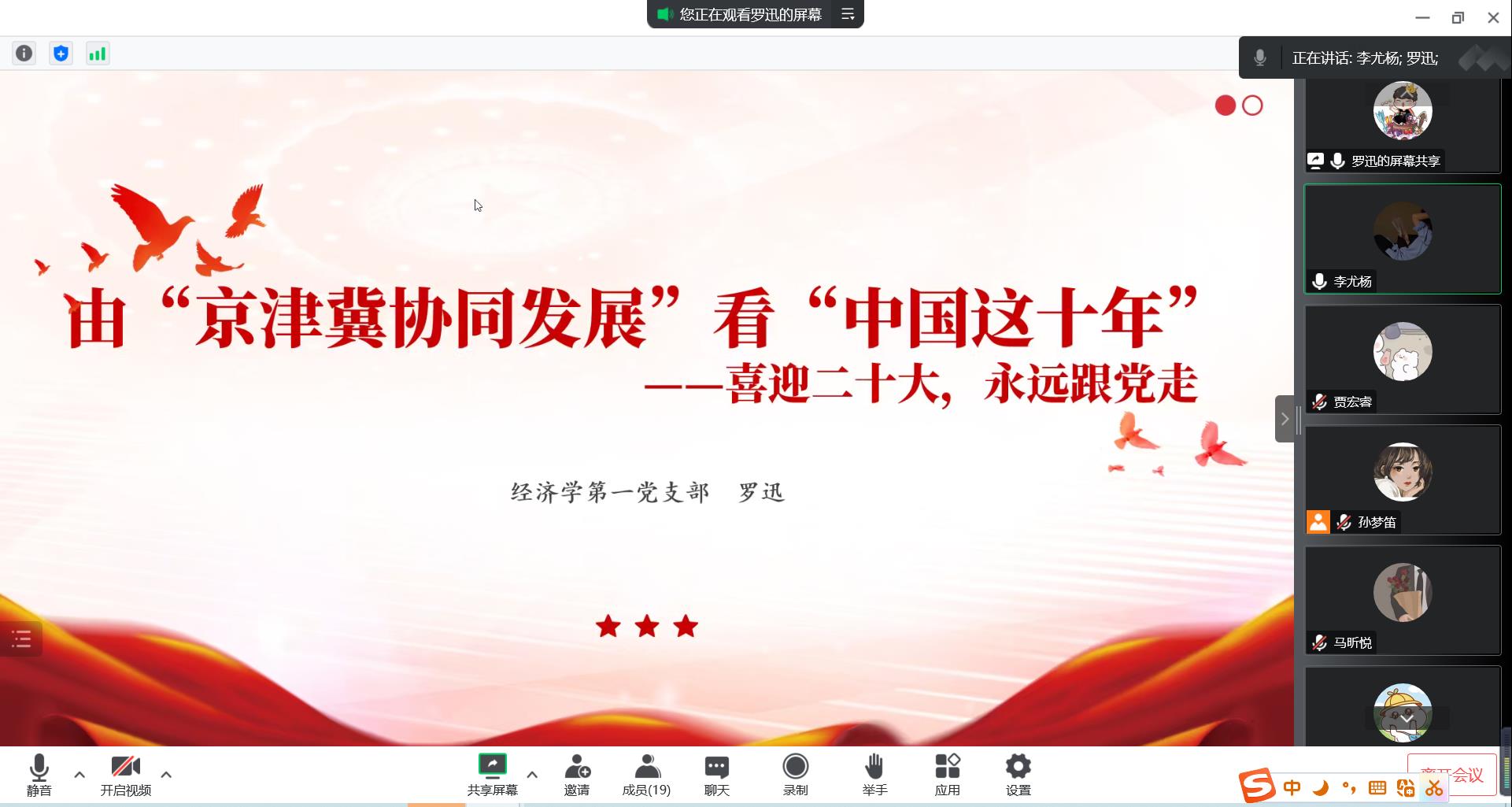 2022年10月15日,98858vip威尼斯下载经济学第一党支部线上开展集体理论学习活动,主题为“喜迎二十大,永远跟党走”。本次理论学习活动由支部组织委员贾宏睿主持。